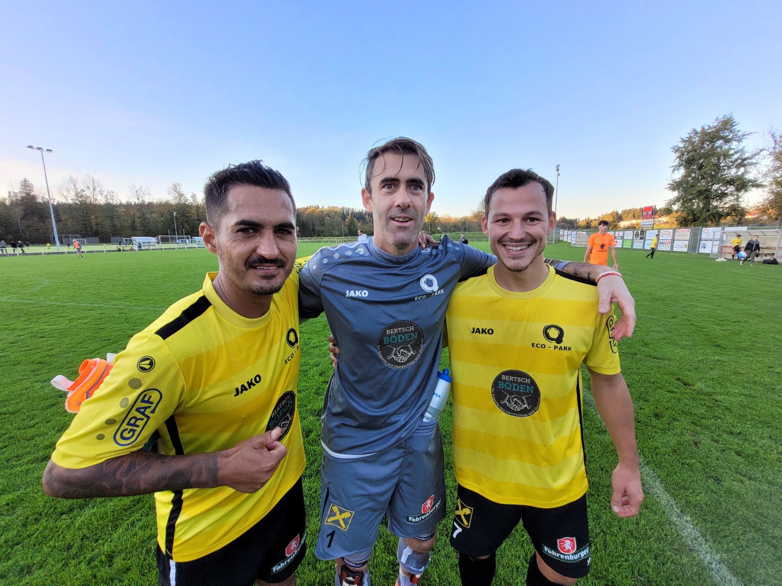 Sidinei Antonio Zeferino De Oliveira und Manuel Sandrisser, im Bild mit Tormann Christian Mendes Cavalcanti, waren die gefeierten Torschützen beim 2:0 Heimsieg gegen die Amateure von Austria Lustenau.