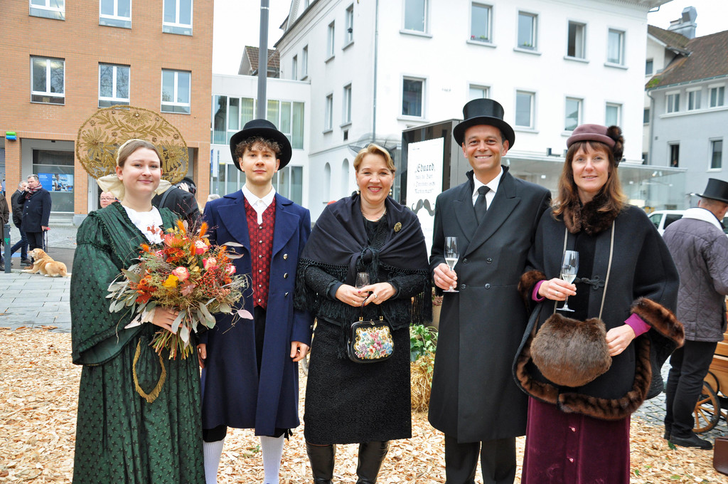 Elena und Johannes in traditioneller Dornbirner Tracht mit Bürgermeisterin Andrea Kaufmann und dem Meckenbeurer Bürgermeister Georg Schellinger mit Begleitung.