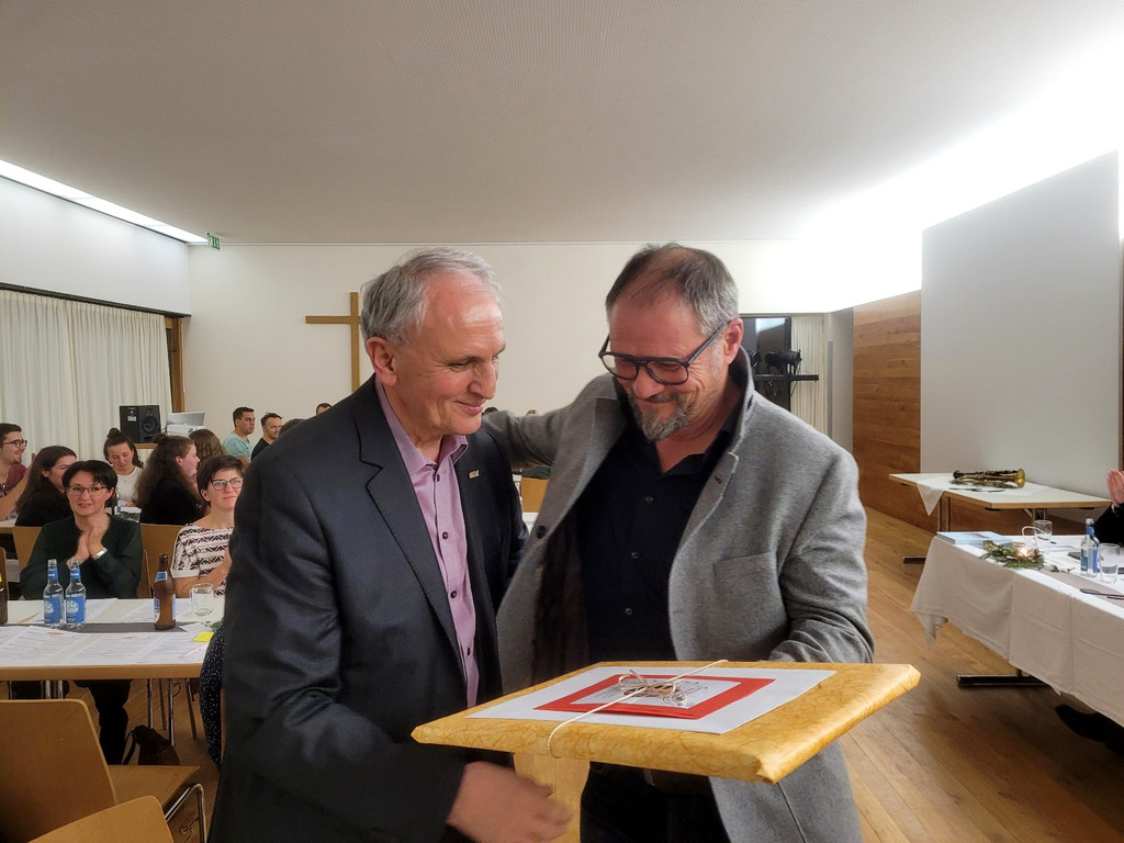 Musikverein Lochau: Ehrenvorstand Wolfram Baldauf übergibt sein Amt an den neuen Vorstand Helmut Immler.