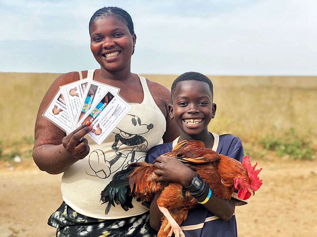 Die Familien bekommen einen Lebensmittelgutschein und ein Huhn.