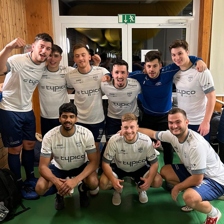 Das Team des SV typico Lochau beim 25. Vorarlberger-Sparkassen-Hallenmasters-Turnier 2023 in Wolfurt beim Einzug ins große Finale: Fabio Feldkircher, Matteo Außerlechner, Marcel Ladinek, Robin Lhotzky, Sandro Eichhübl und Rene Nesensohn (hinten); Kisanthan Nagarasa, Patrick Prantl und Benjamin Kaufmann (vorne).