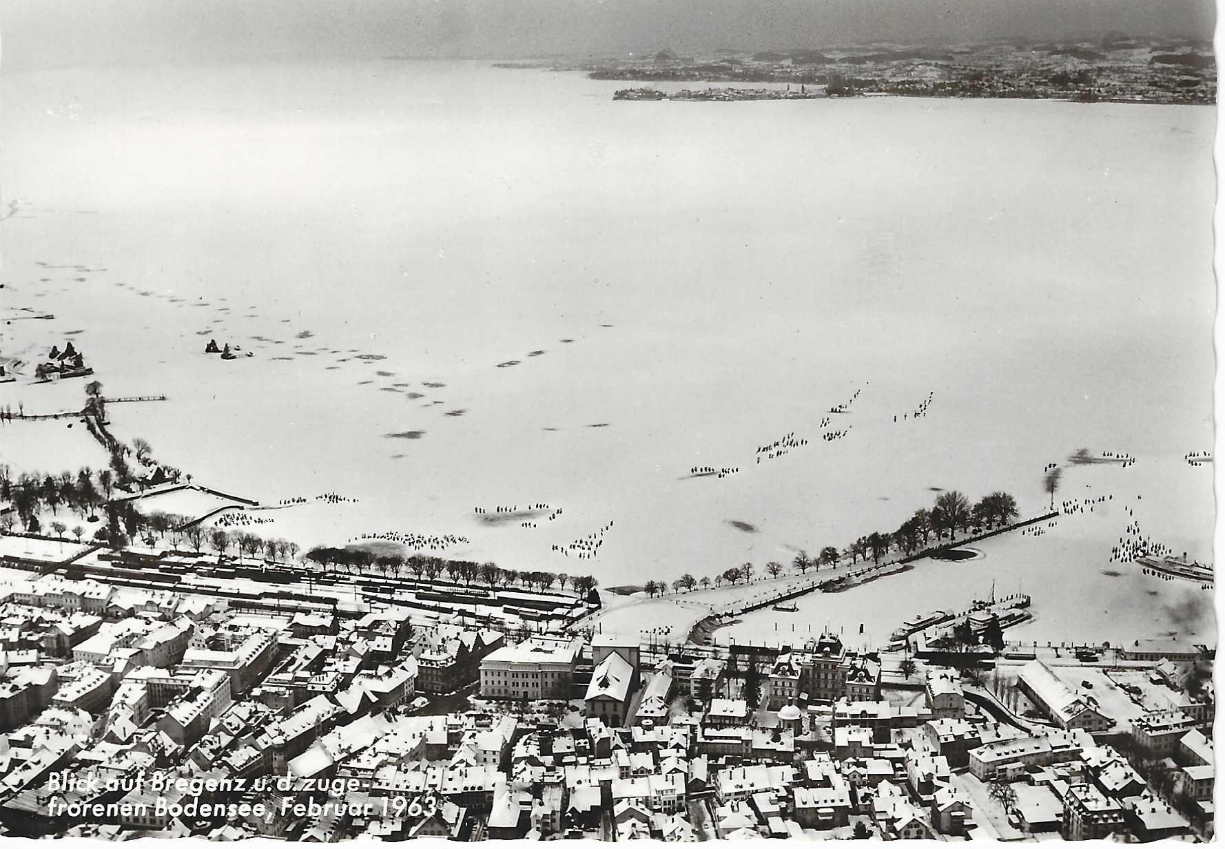 Völkerwanderung auf dem Bodensee zwischen Bregenz und Lindau bei der letzten großen anerkannten kompletten Seegfrörne vor 60 Jahren im Februar 1963. (Foto: Sammlung OGS/BMS)