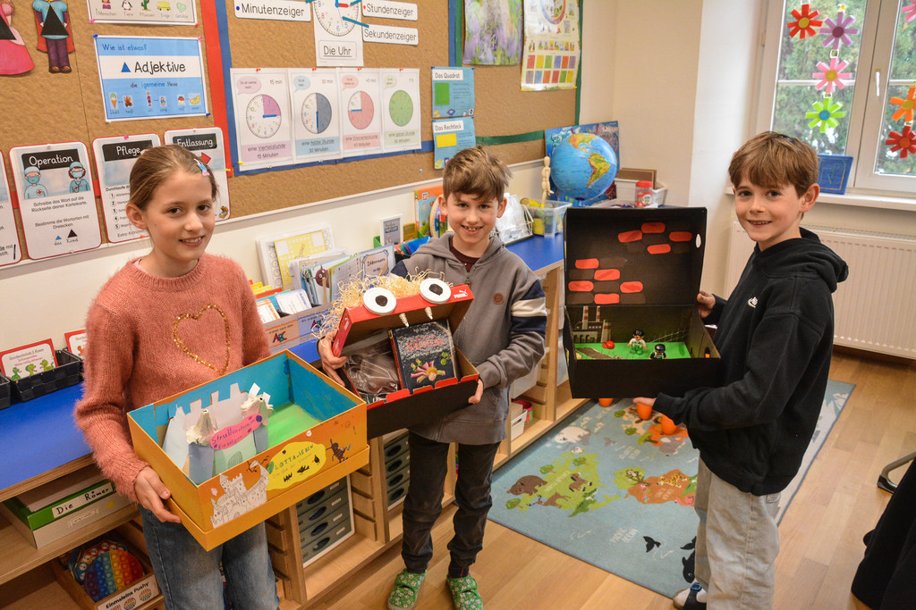Laura Wehrle (9) aus Walzenhausen, Fabio Gozzi (9) aus Lustenau und Benjamin Redler (8) aus Lauterach (v.l.n.r.) zeigten stolz ihre selbstgebastelten Bücherboxen.