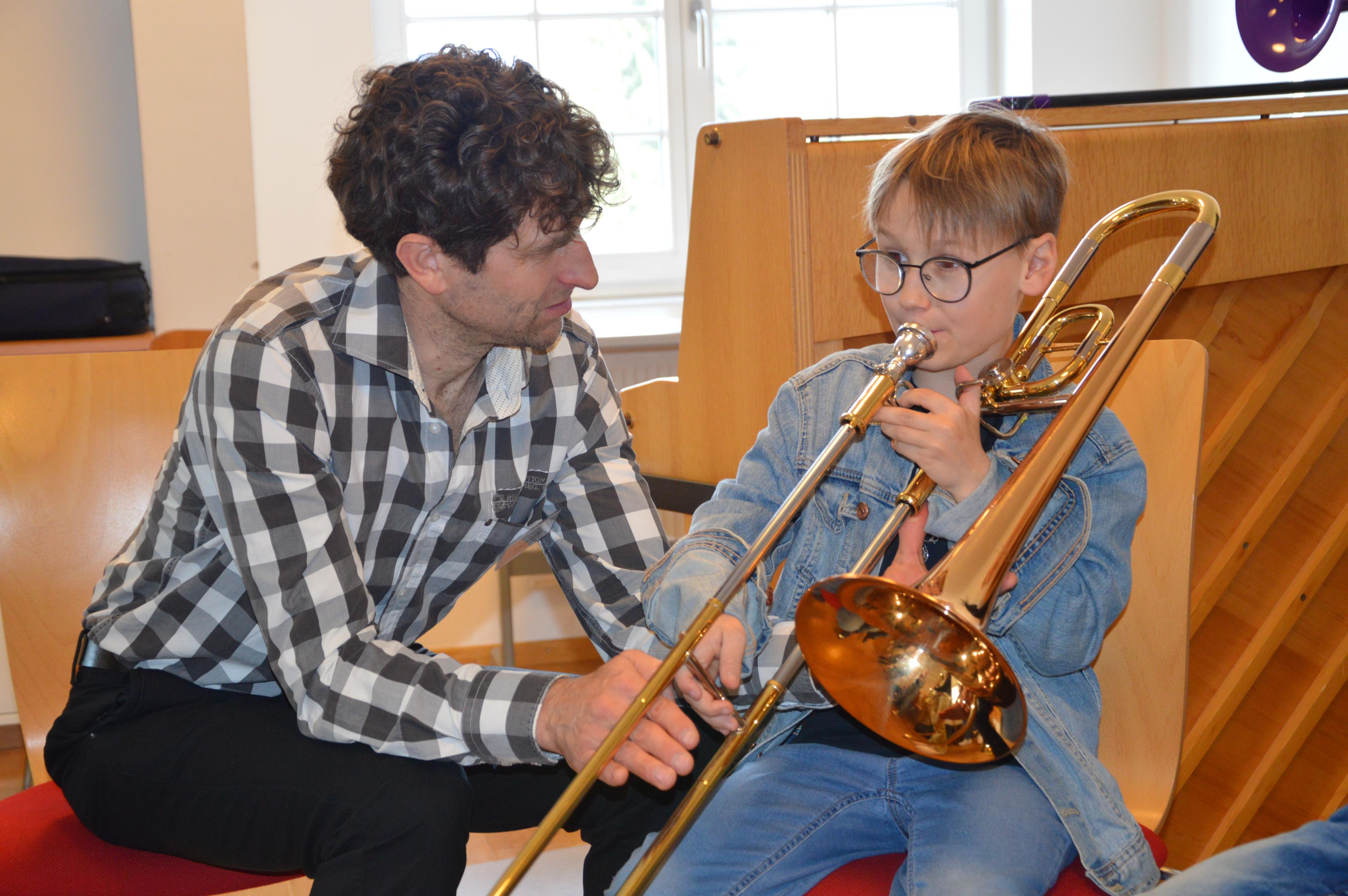 Fachlehrer Stefan Bär zeigt Max (10), wie die Posaune funktioniert