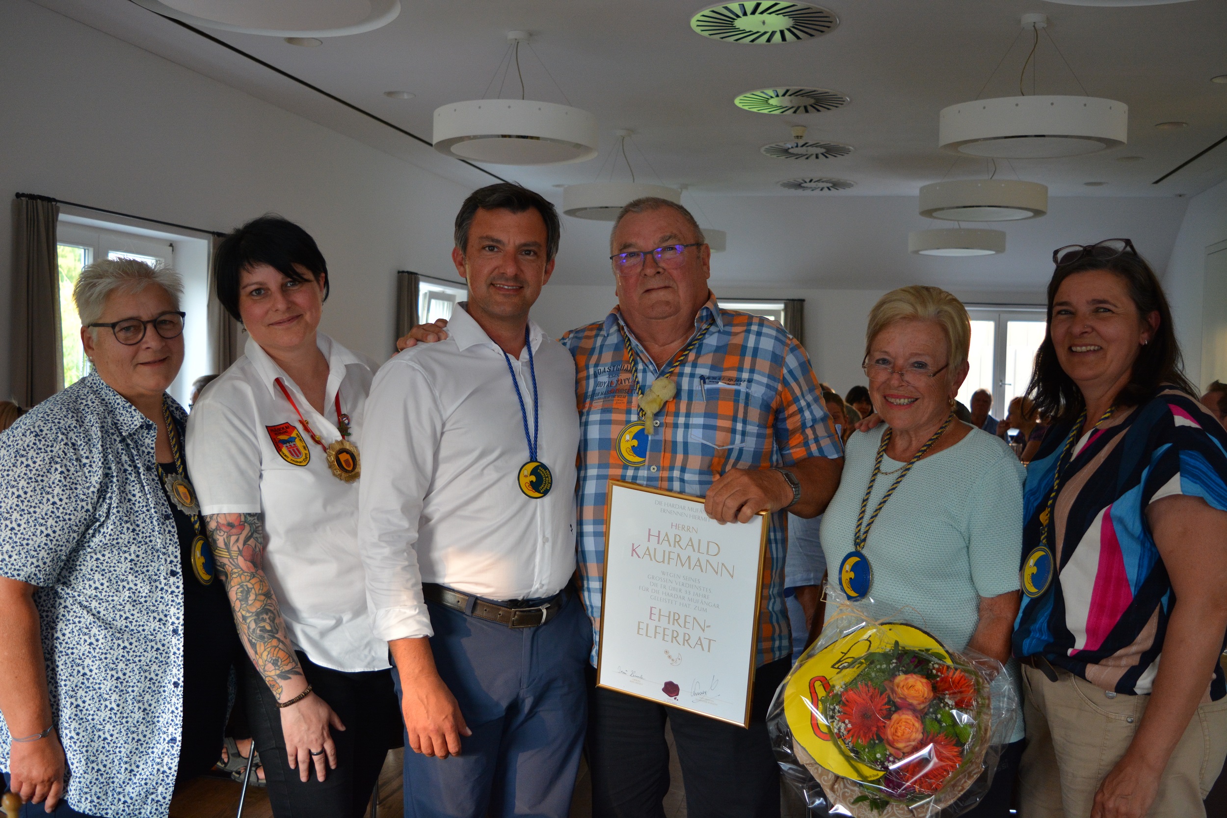 Mit Ehrenelferratsurkunde und goldenem Mond ausgezeichnet: Harald Kaufmann (Bildmitte) mit Gattin Grete und Ordensverleiherin und 11er-Rätin Gabi Höfle-Kaufmann (r.i.B.). Von links Obfrau Irmi Heinzle mit VVF Präsidentin Barbara Lässer und Bürgermeister Martin Staudinger.