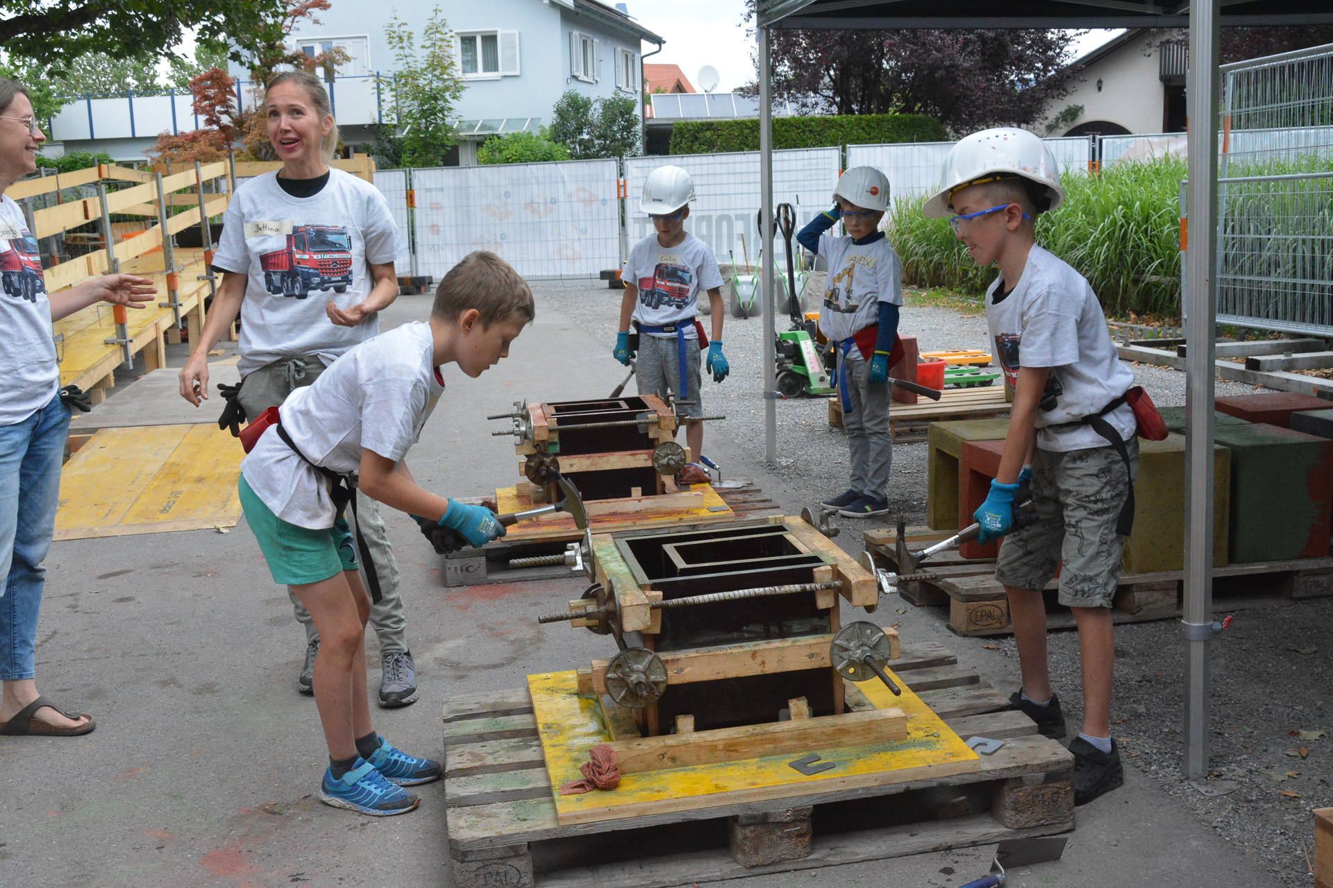 Auf der Baustelle vor der Schule stellen die Schüler Betonhocker her.