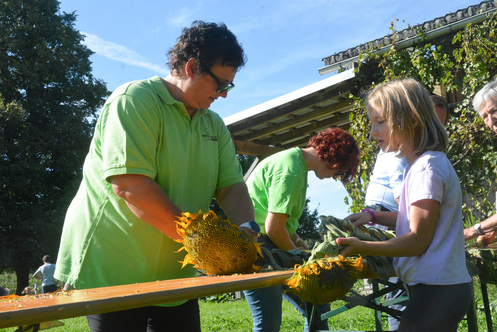 OGV-Obfrau Cornelia Maier ermittelte gemeinsam mit Vizebürgermeister Daniel Steinhofer die größte Sonnenblume.