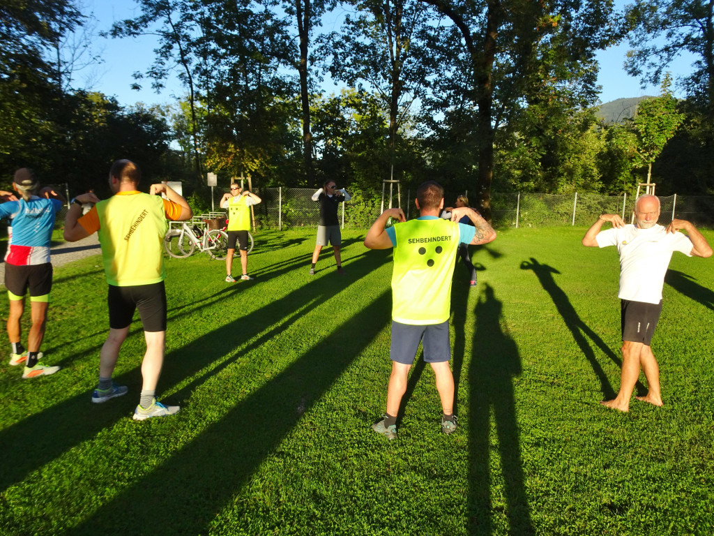 Vor der Laufstrecke geht es zunächst auf den Rasen in der Birkenwiese zum gemeinsamen Aufwärmen.