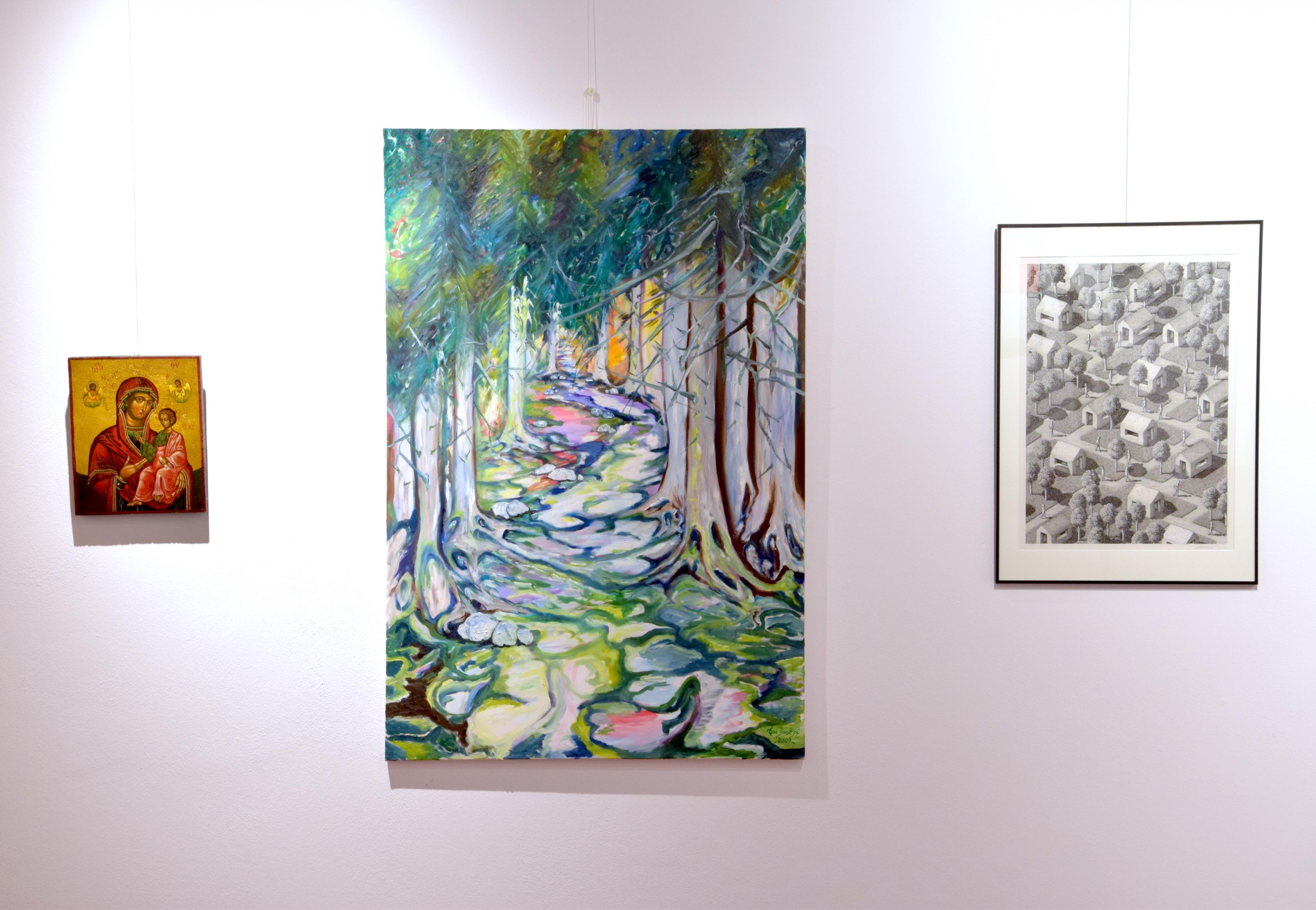 Werke von Kurt Bonner (Jugoslawische Ikone: die Hinweisende, Blattgold und Eitempera, links), Tom Josepf (Römerweg 2009, Öl auf Leinwand, Mitte) und Michael Salvadori (Kleinstadt, Tuschezeichnung, 2023).