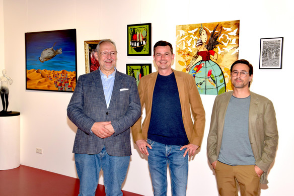 Maximilian Fritsche (l.) mit Schwiegersohn Stephan O. Slupetzky (M.) und Vernissage-Gast Daniel Thanei.