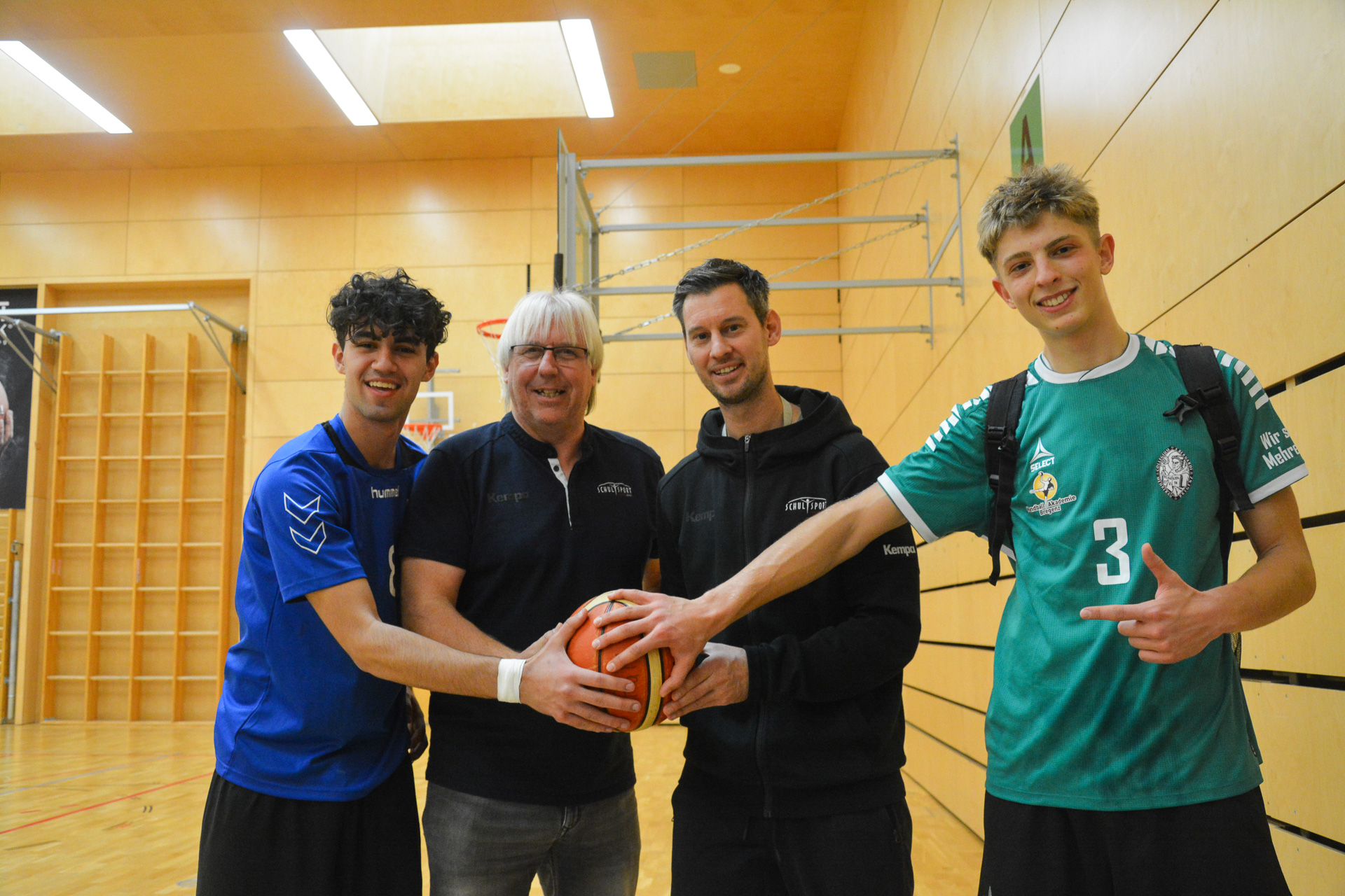 Am Freitag spielten Teams aus 13 Schulen aus ganz Vorarlberg gegeneinander Basketball. Schulsportreferent Christoph Neyer (2.v.l.) und Landesreferent Andreas Khüny (3.v.l.) freuten sich über das rege Interesse an diesem Sport.