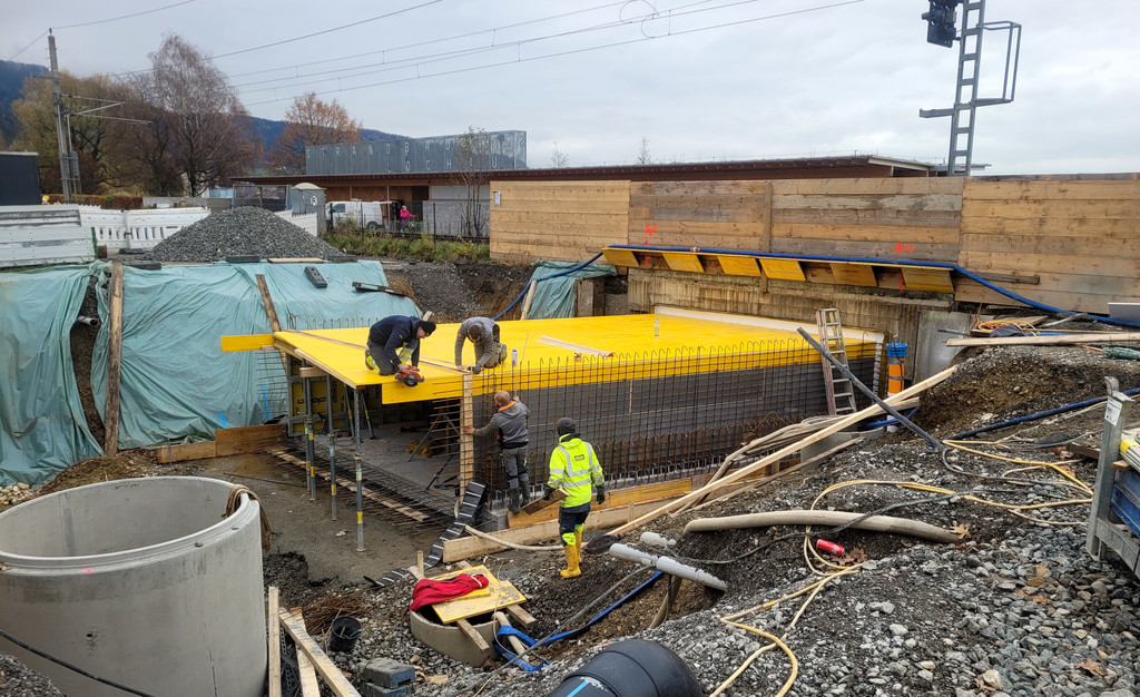 In konventioneller offener Bauweise mit Schalung und Ortsbeton wird am Kugelbeerbach unter der L 190 ein schachtförmiger Durchlass erstellt.
