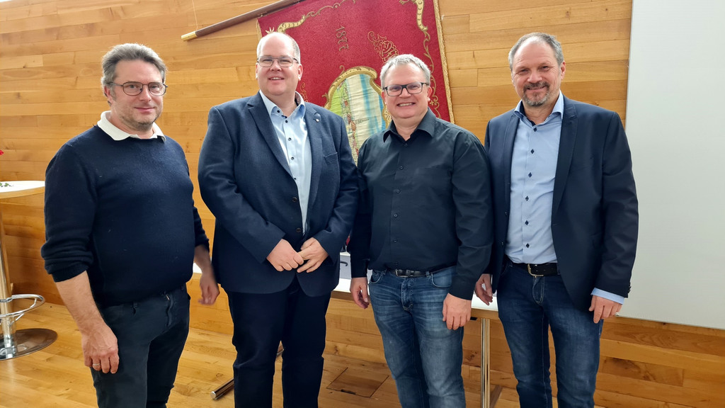 Probenbelohnungen für Martin Mark und Michael Schmid, im Bild mit Kapellmeister Harald Schele und Vorstand Helmut Immler.