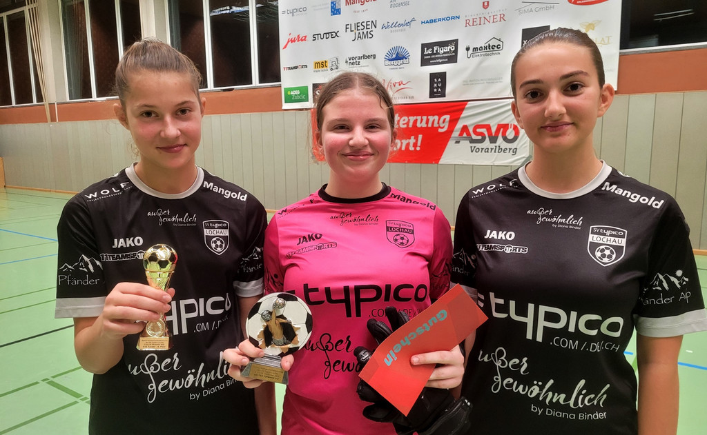 Lena Kronreif und Carina Schröder mit Jana Golob von der Mädchenmannschaft des SV typico Lochau, die zur besten Torfrau der U12 Teams gewählt wurde.