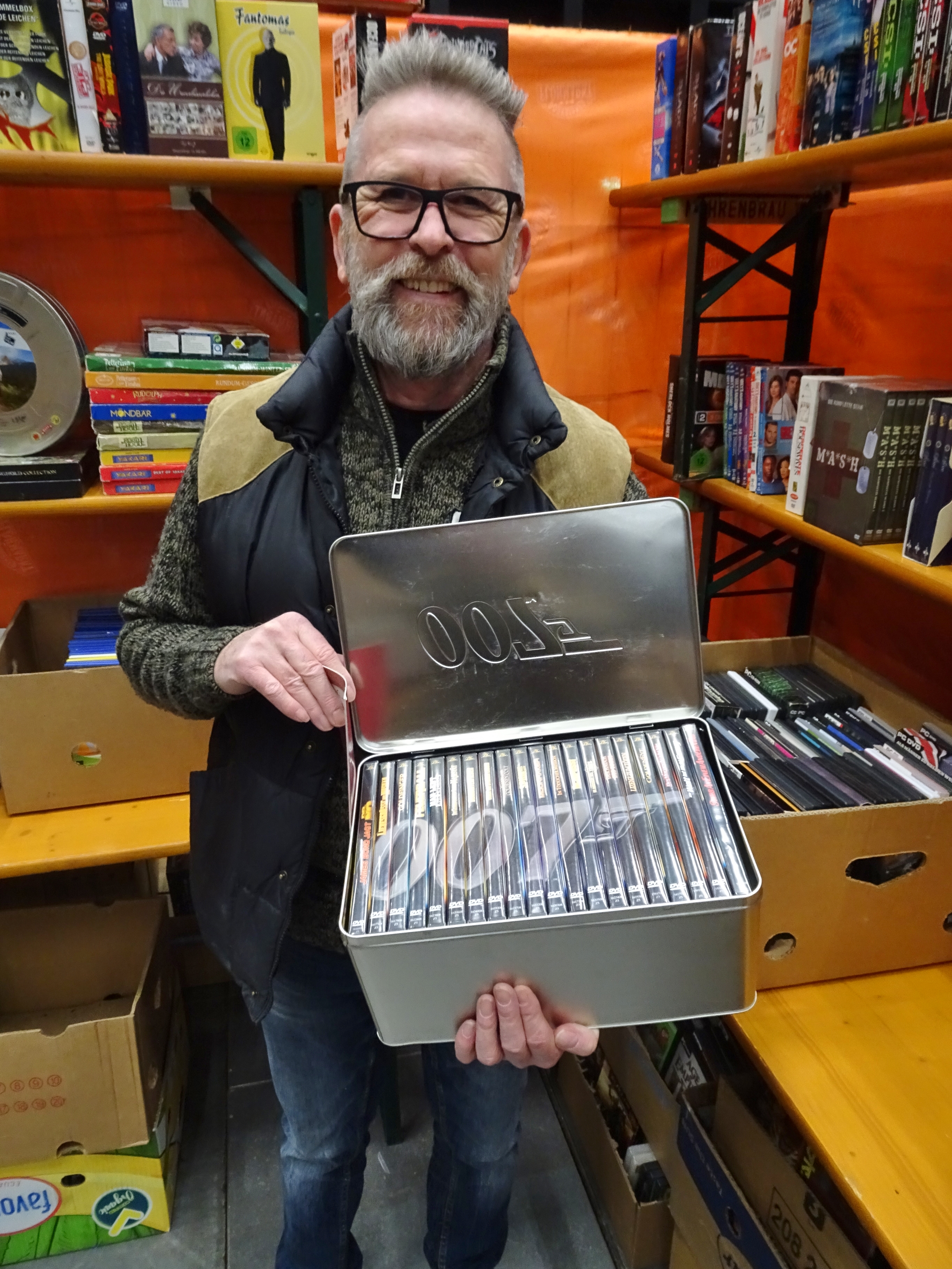 Stolz präsentiert Fritz Günther einer seiner Schätze, eine selten James Bond-Kollektion.