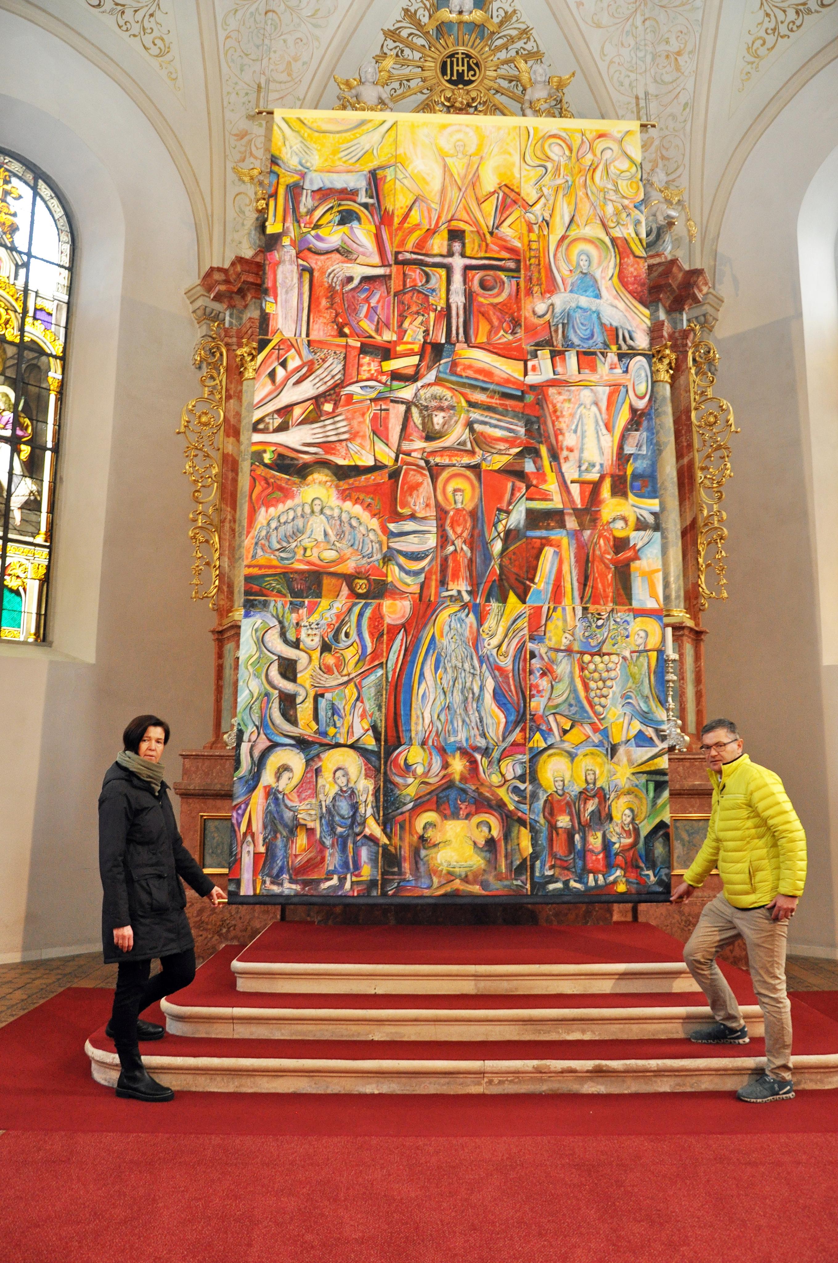 Während draußen der Faschingsumzug Aufstellung nahm, hängten drinnen in der Kirche Bettina und Wolfgang Spiegel das Fastentuch auf.