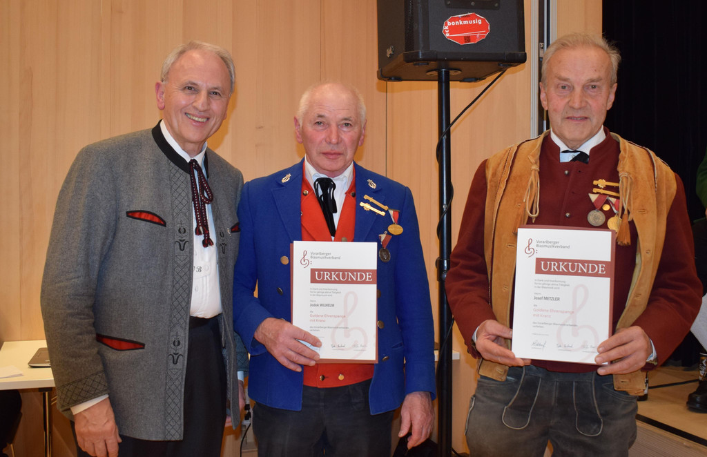 Landesobmann Wolfram Baldauf gratuliert Jodok Wilhelm und Josef Metzler.