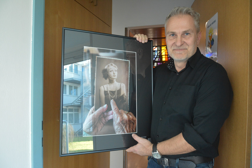 Obmann Marcel Egger zeigte eines seiner Bilder der damaligen Ausstellung "Hände", das nun im Seniorenhaus ausgestellt ist.