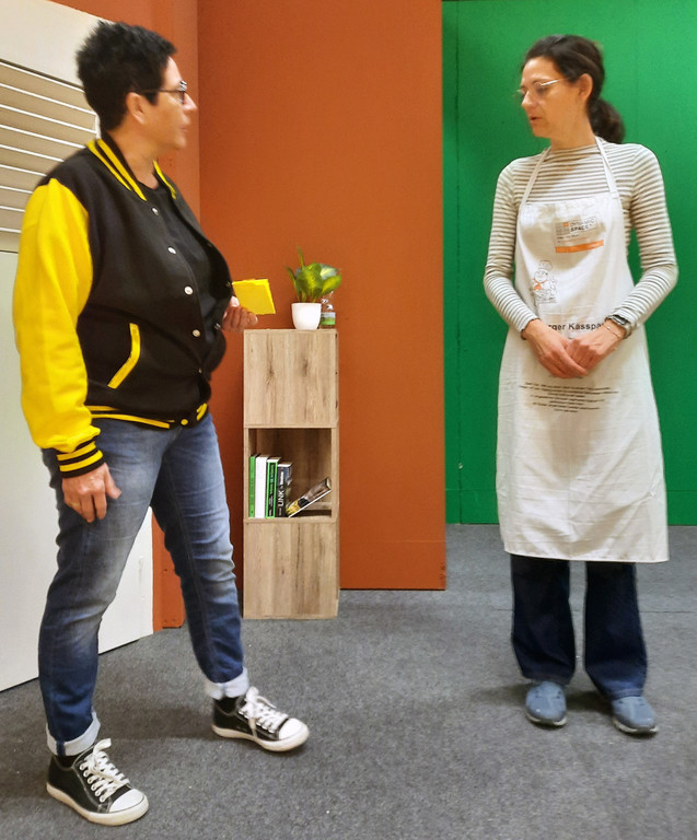 Theresia Immler (li.) in der Rolle als Taxifahrerin „Ruth Gertrud“ und Claudia Rusch als „Hedy“