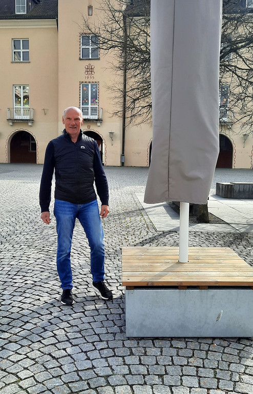GR Josef Berkmann rüstet sich am unteren Kirchplatz auf die neue Marktsaison. Da spielen auch die großen Schirme zur Beschattung eine Rolle.
