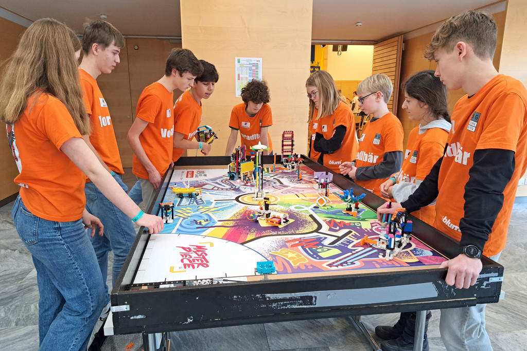 Die Jugendlichen haben den Roboter so geplant, konstruiert und programmiert, dass er die Aufgaben des vorgegebenen Robot-Games erfüllt.