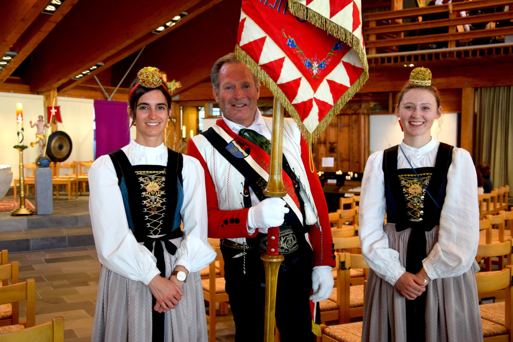 Marketenderinnen Theresa Jochum (l.) und  Emilie Wagner mit Fähnrich Andreas Würfl