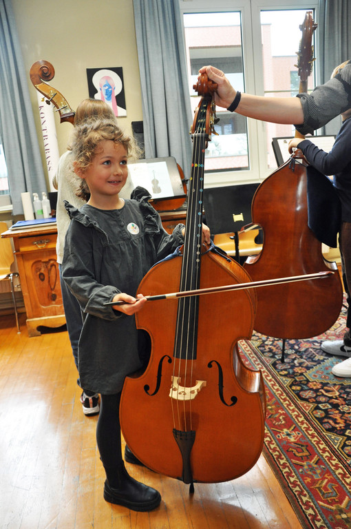 Ehrfürchtig wagten sich die Kinder auch an die großen Instrumente.