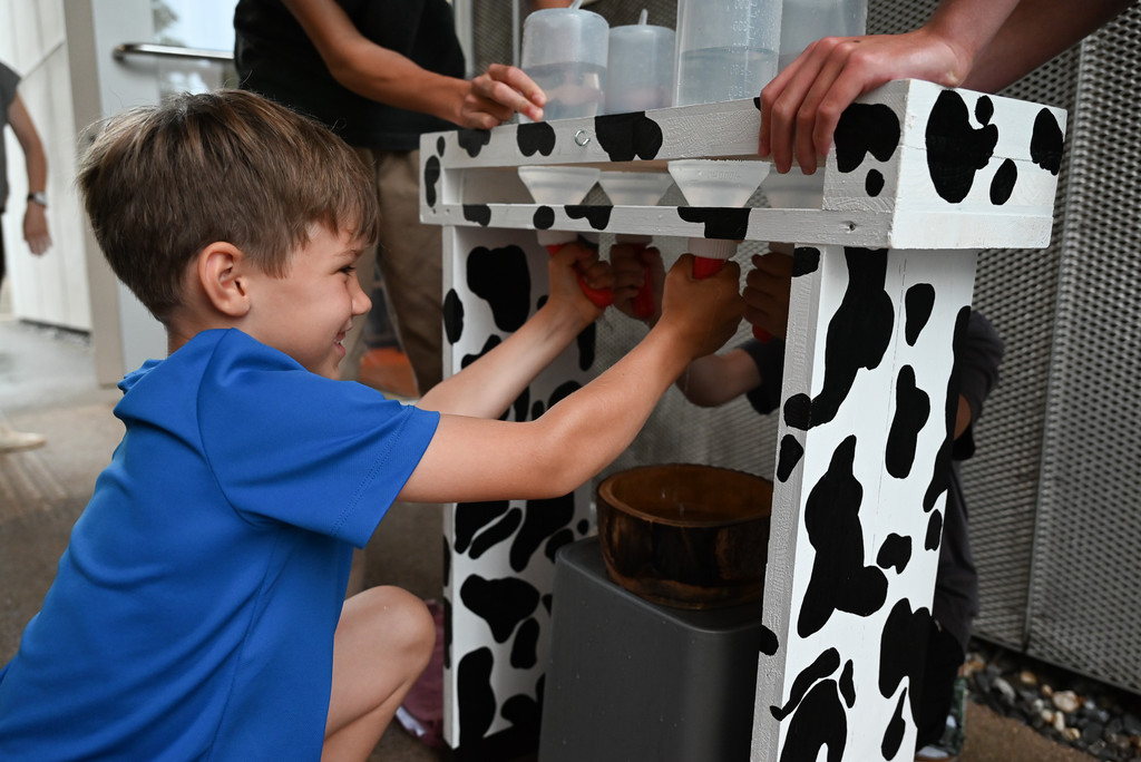 Die gesamte Klasse musste in einer vorgegebenen Zeit möglichst viel Wasser von der "Kuh" melken.