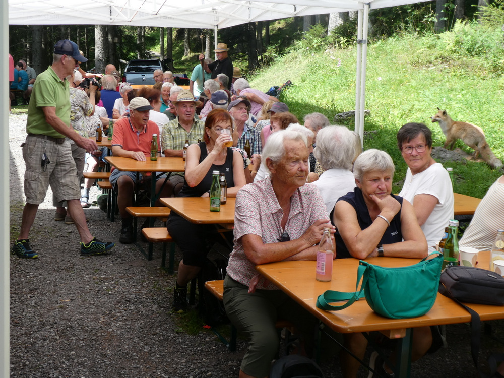 90 Mitglieder des Vereins Vorarlberg50plus von Sulz, Röthis und Viktorsberg sind am 12.8. bei strahlendem, aber sehr heißem Wetter der Einladung gefolgt, zur Jagdhütte „Bäralacha“ in Dafins zu wandern.