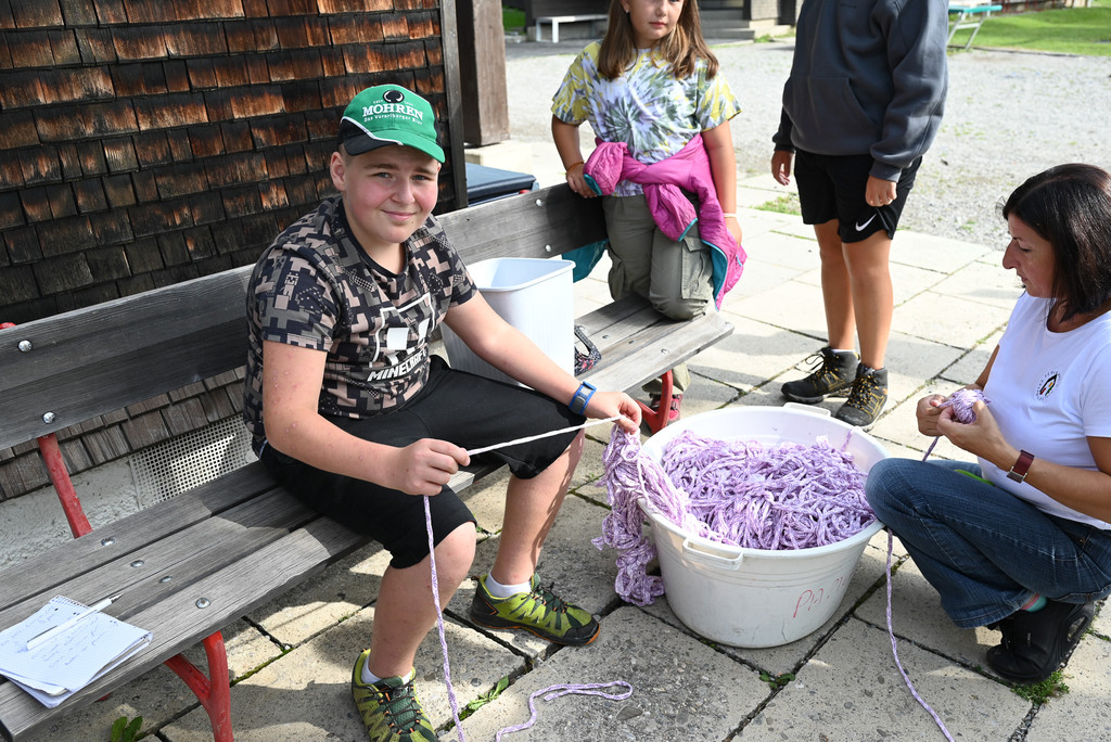 Damit die Hütten im Wald gebaut werden können, wickelt Julian (11) alle Fäden auf.