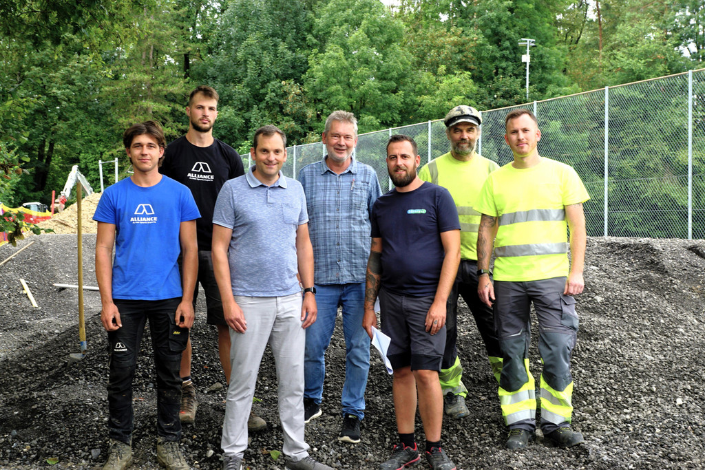 Mitarbeiter der Fa. Alliance (li.) mit Bgm. Andreas Kresser und Horst Schober (Bauamt) sowie eine Abordnung des Bauhofteams, die das Projekt tatkräftig unterstützen