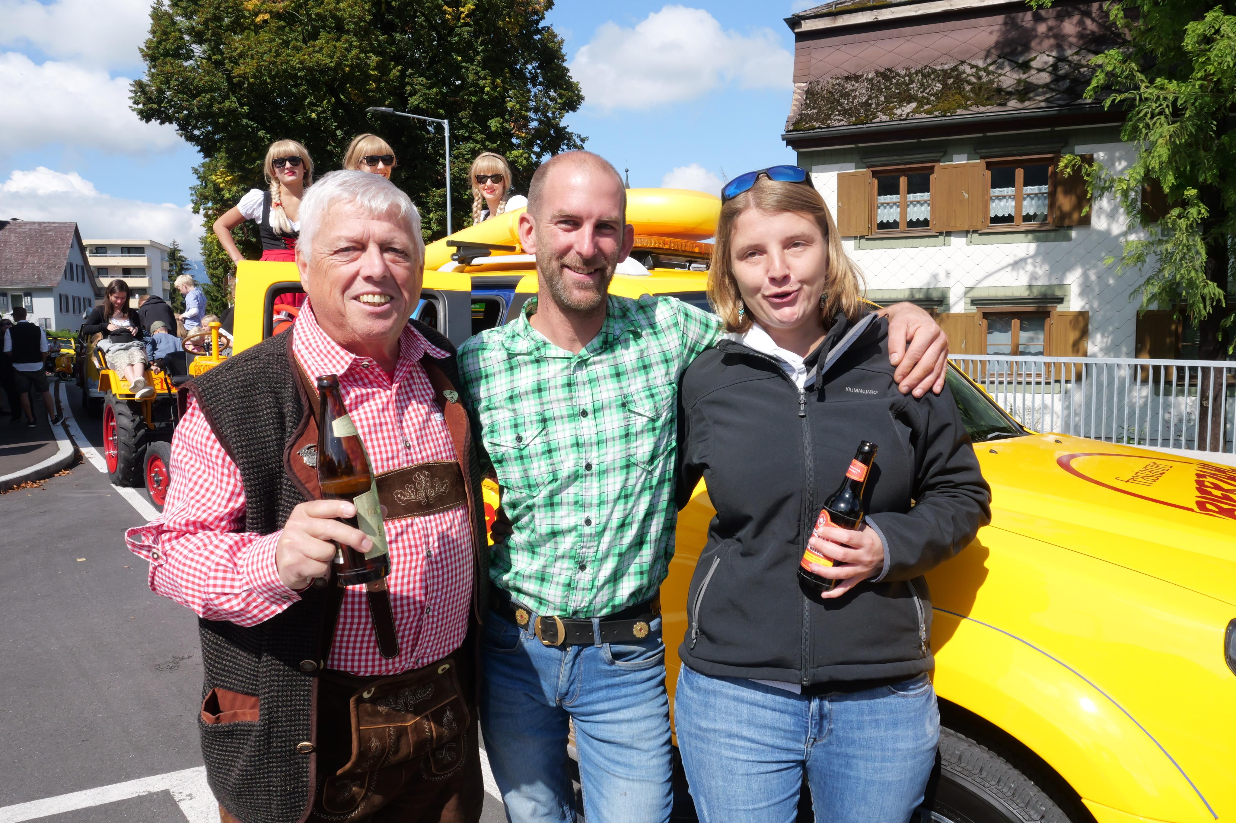 Walter "Cebi" Gabriel, Marco Marte und Tamara Kabusch vor dem "Biermobil".
