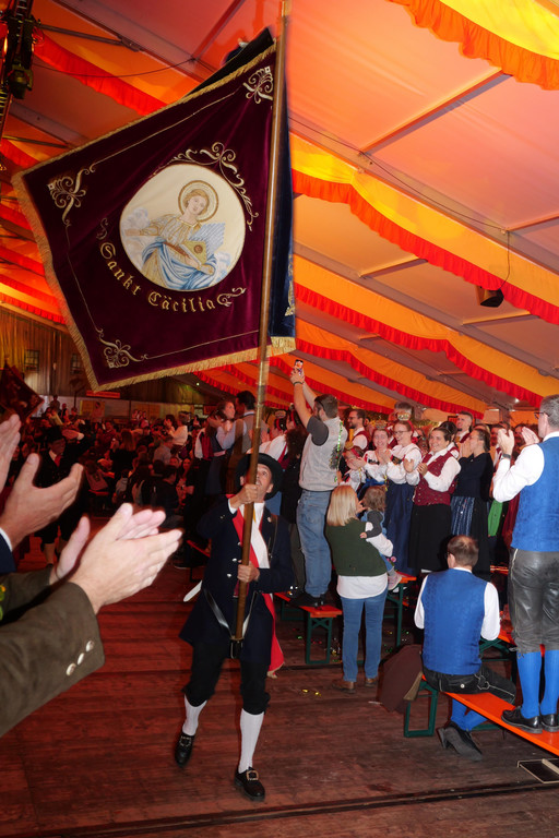 Feierlicher Einzug der Fahnenträger im Festzelt, wo sie von Thomas Filz begrüßt wurden.