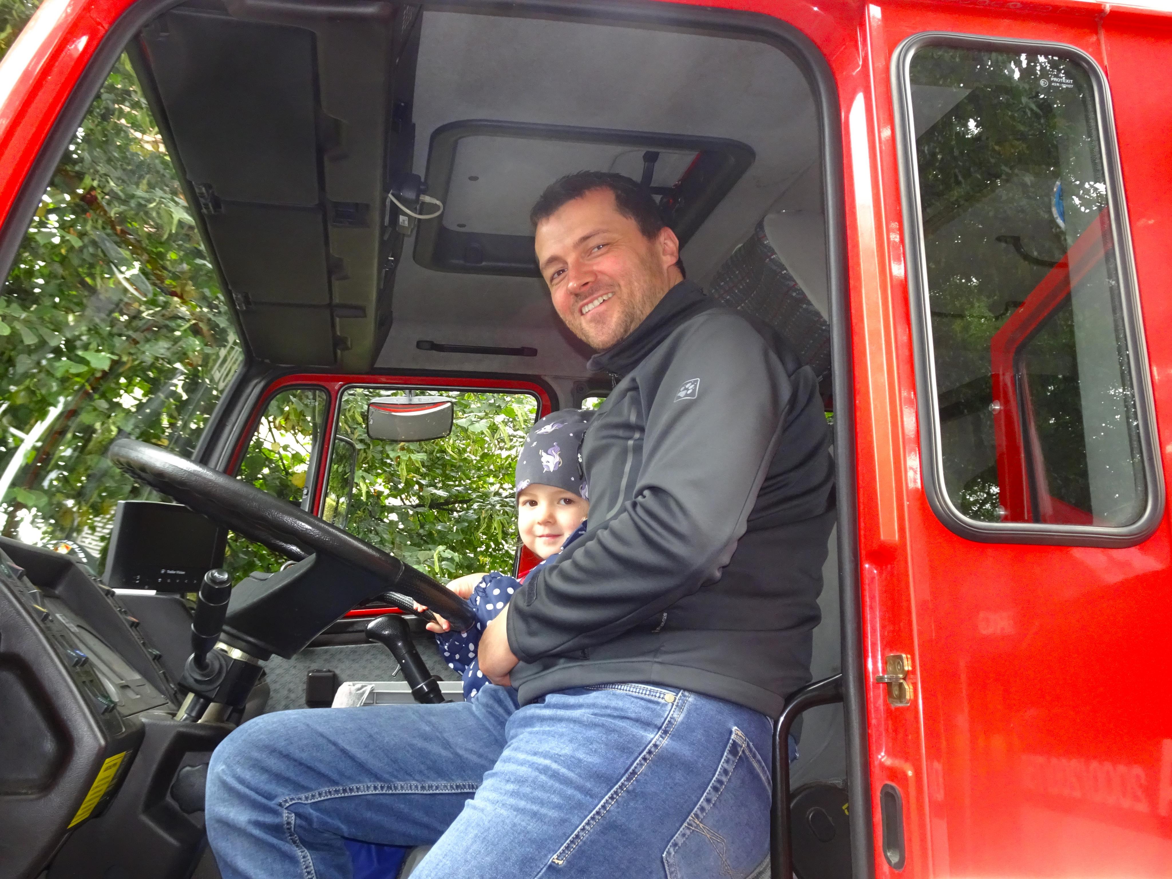 Markus und Amilia nahmen im Feuerwehrauto Platz.