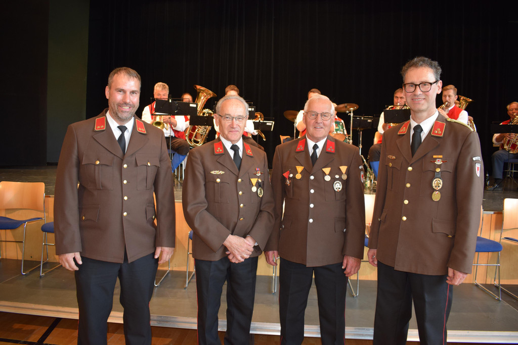 Kommandant Reinhard Bereuter und Stellvertreter Stefan Sohm gratulieren Peter Bereuter und Herbert Kühne zum 60-jährigen Jubiläum.