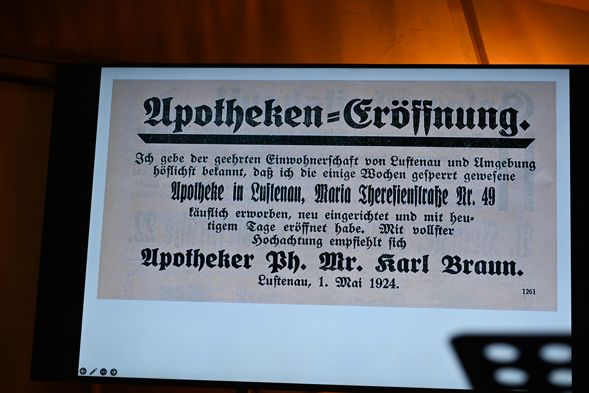 Mti einem Inserat im Lustenauer Gemeindeblatt kündigte der Großvater von Karl Braun im Jahr 1924 die Eröffnung der Apotheke an.
