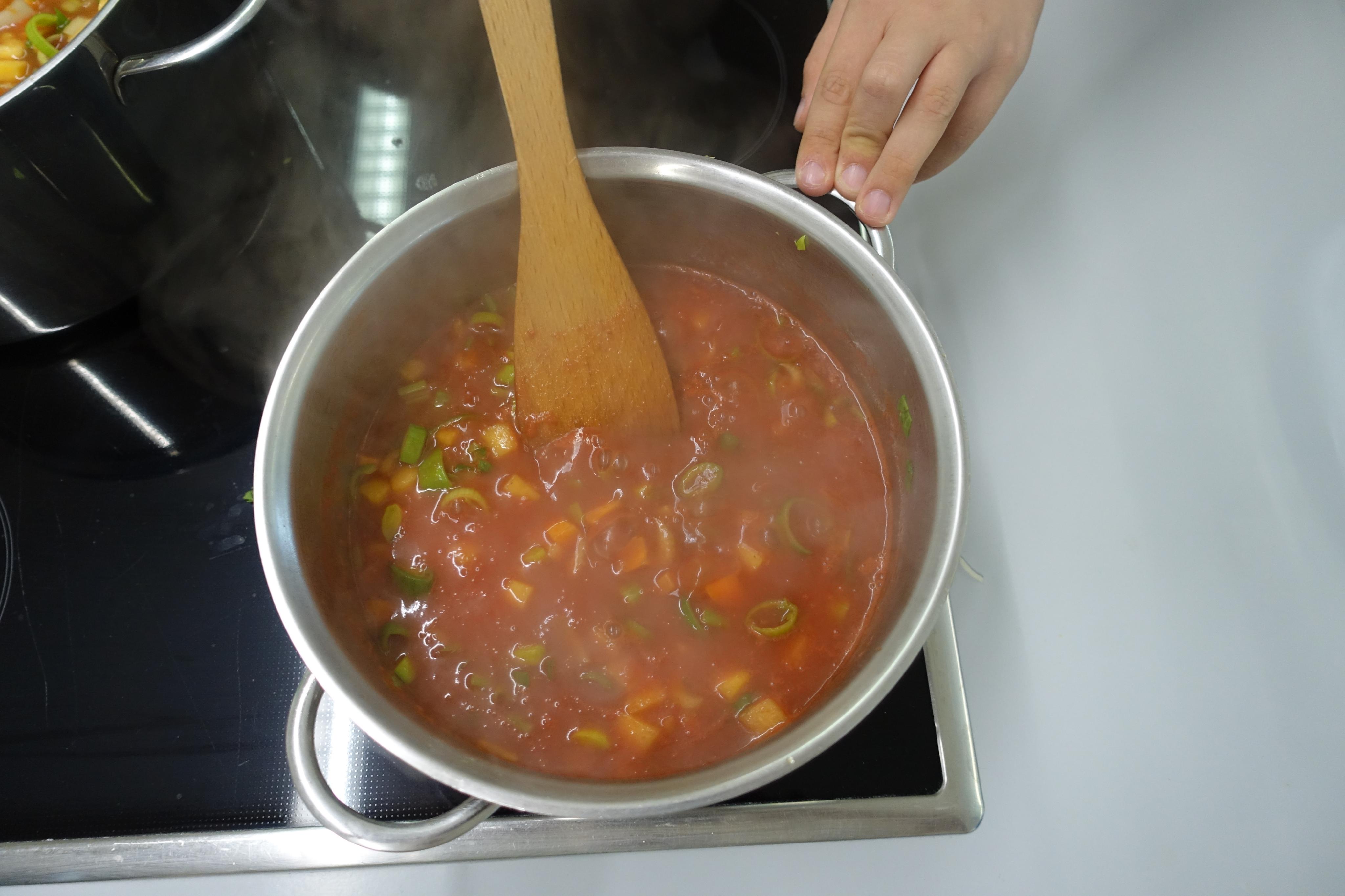 Die Ribollita brodelt im Topf – eine traditionelle Restesuppe aus Italien, zubereitet von den Schüler*innen der 3c.