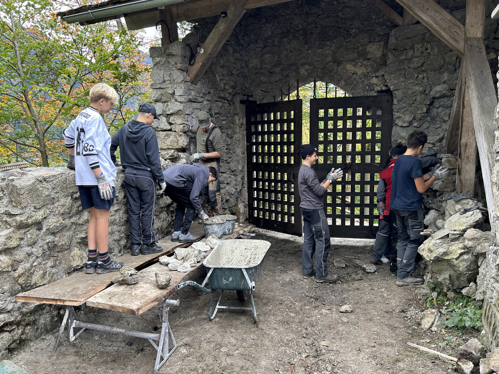 Die Schüler betätigten sich unter anderem bei Renovierungsarbeiten des Mauerwerks am Eingangstor.