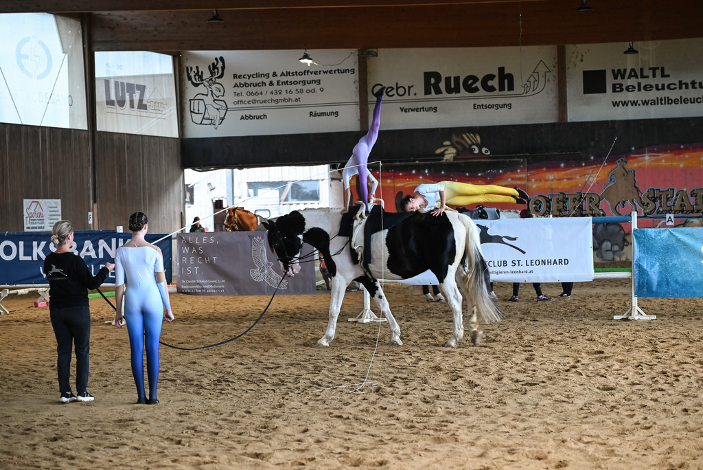 Akrobatische Übungen auf galoppierenden Pferden.