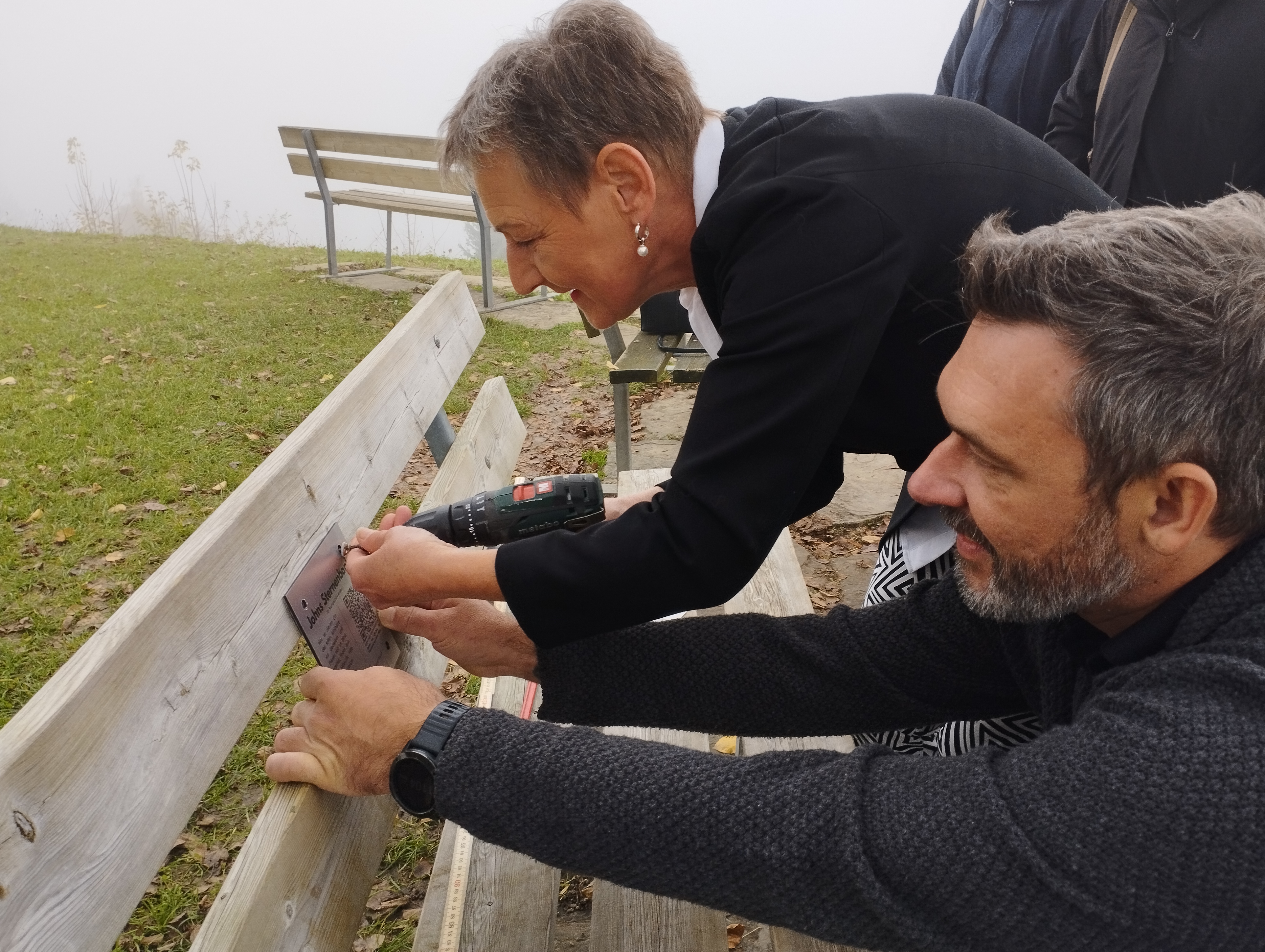 Kleine Metalltafeln an den Bänken machen auf die Initiative aufmerksam.