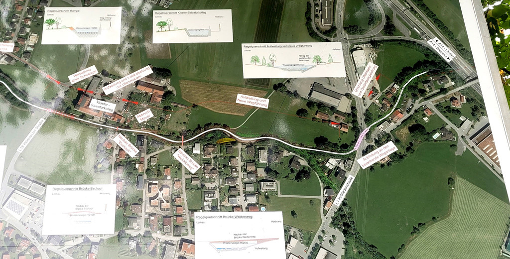 Eine große Bautafel informiert über das Hochwasserschutzprojekt Ruggbach, hier im Speziellen über den Bereich Salvatorkolleg-Areal von der Eschachbrücke bis hinauf zur L1 Hofriedenstraße/Lochau bzw. Allgäustraße/Hörbranz.