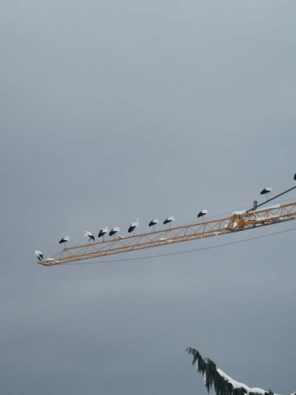 Störche schlafen auf einem Baukran