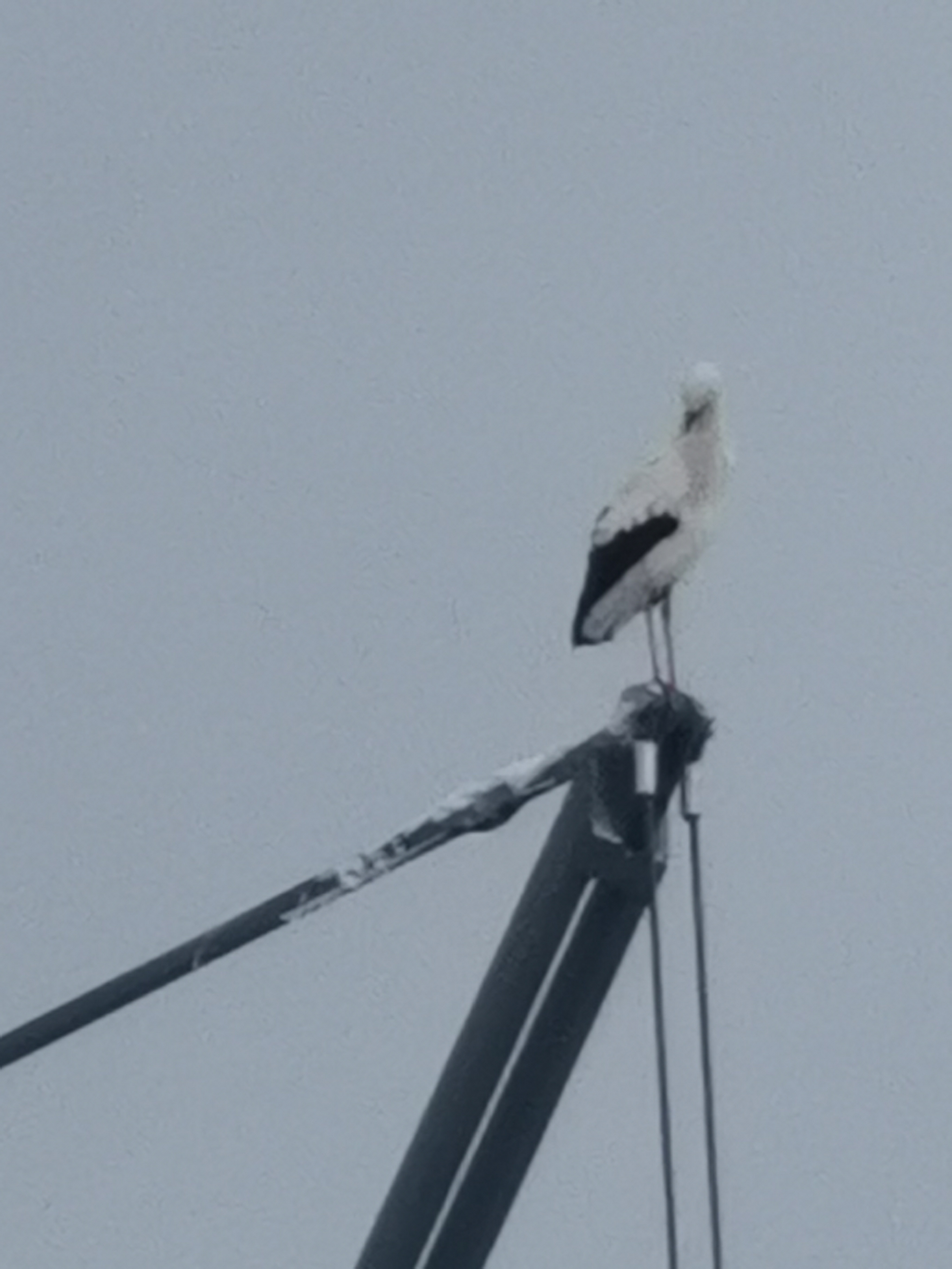 Störche schlafen auf einem Baukran