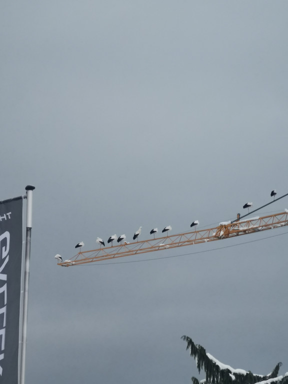 Störche schlafen auf einem Baukran