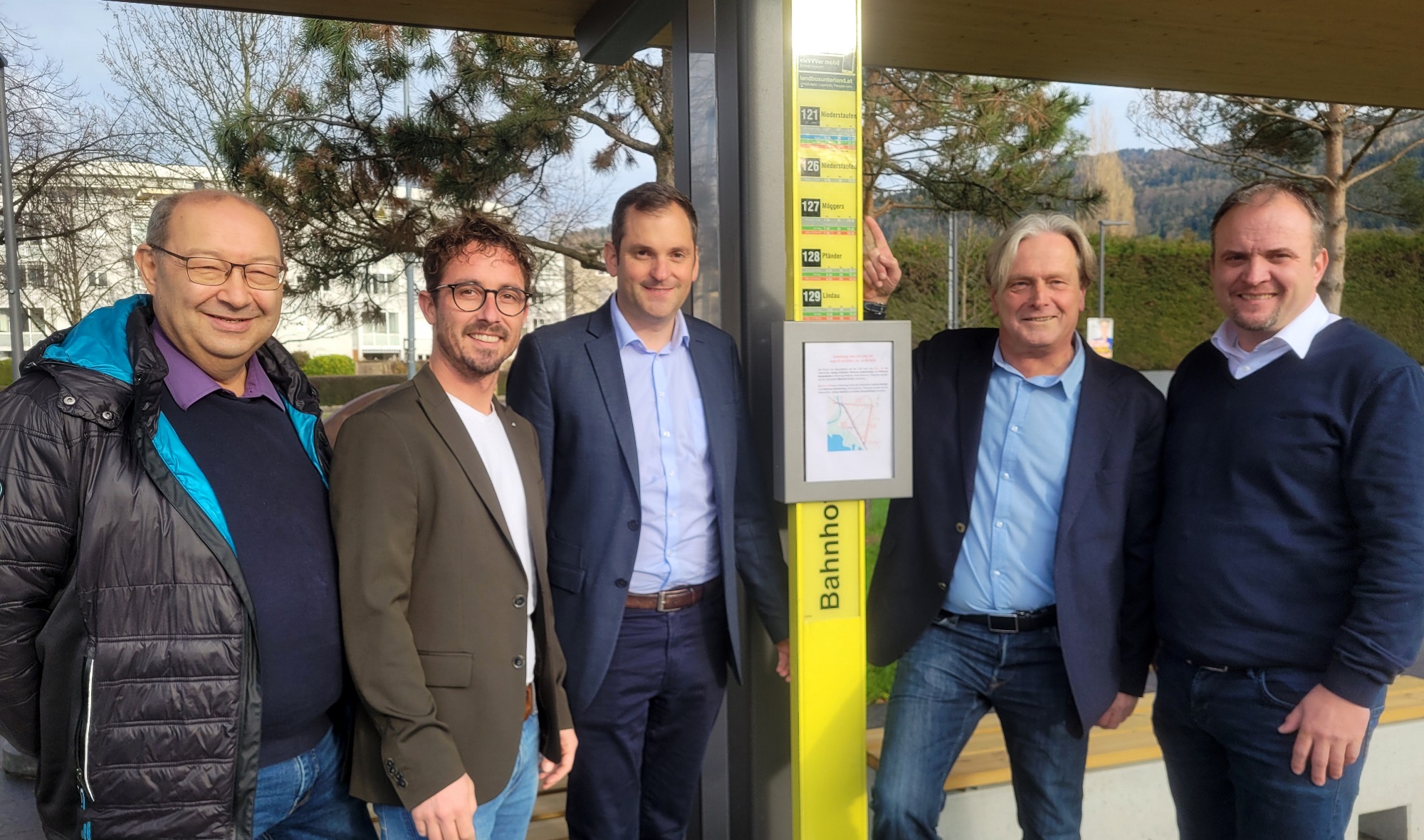 Auch die Bürgermeister des Leiblachtals besichtigten im Rahmen ihres regelmäßigen Bürgermeistertreffens das bestens gelungenes Mobilitätsprojekt: Wolfgang Langes (Hohenweiler), Lukas Greussing (Möggers), Andreas Kresser (Hörbranz), Frank Matt (Lochau) und Nico Flachsenberger (Eichenberg).