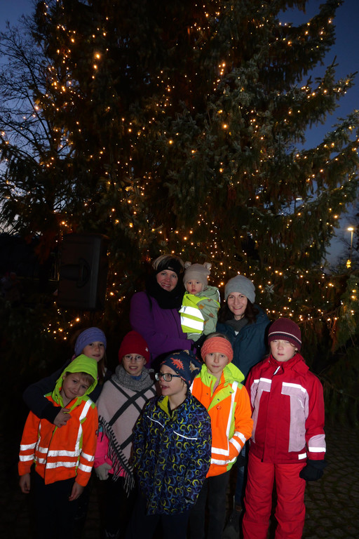Unter dem hell erleuchteten Weihnachtsbaum rückten die Kinder dicht zusammen.