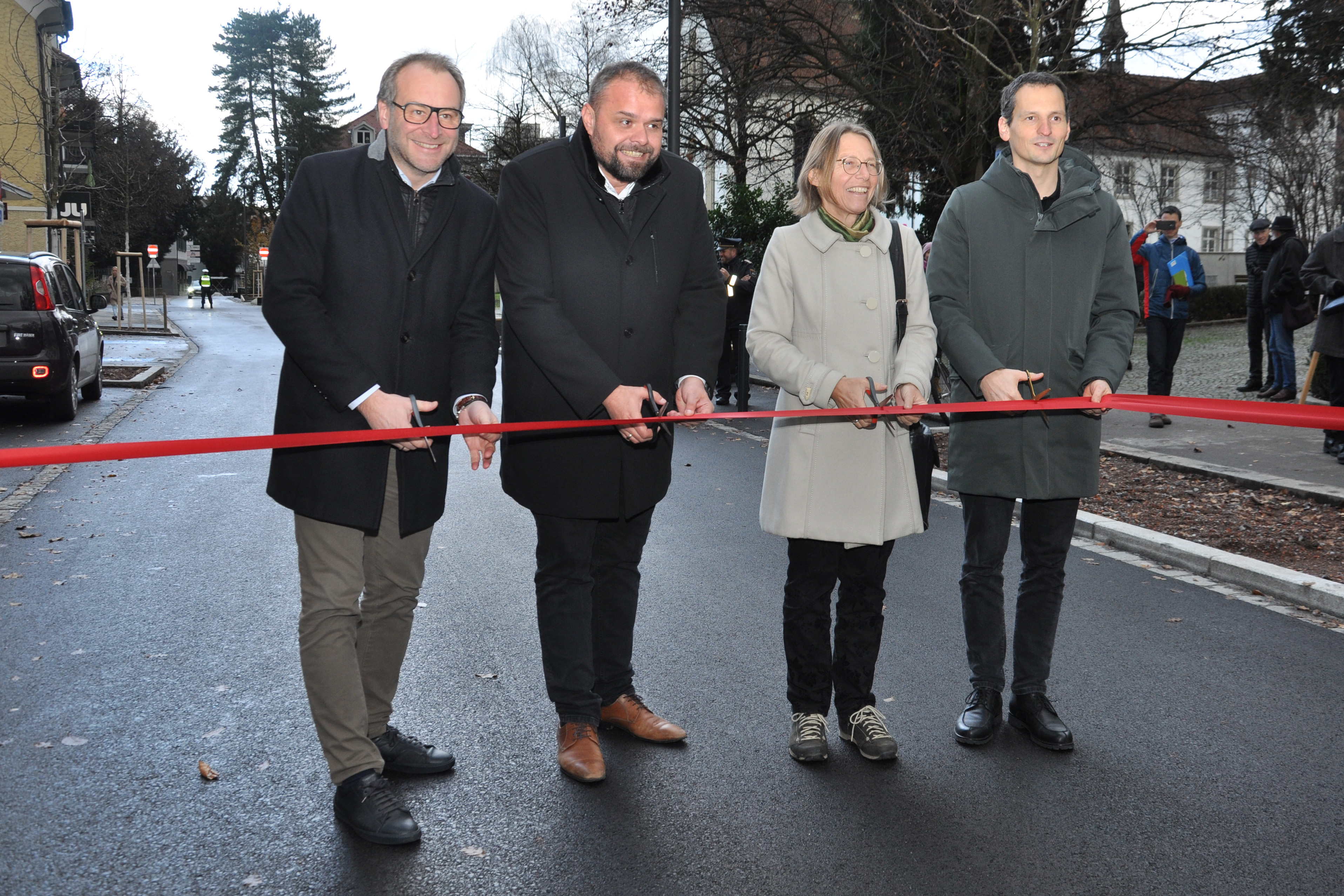 Die Stadträte Alexander Juen, Markus Fäßler und Juliane Alton durchschnitten mit Bürgermeister Julian Fässler das symbolische Band.