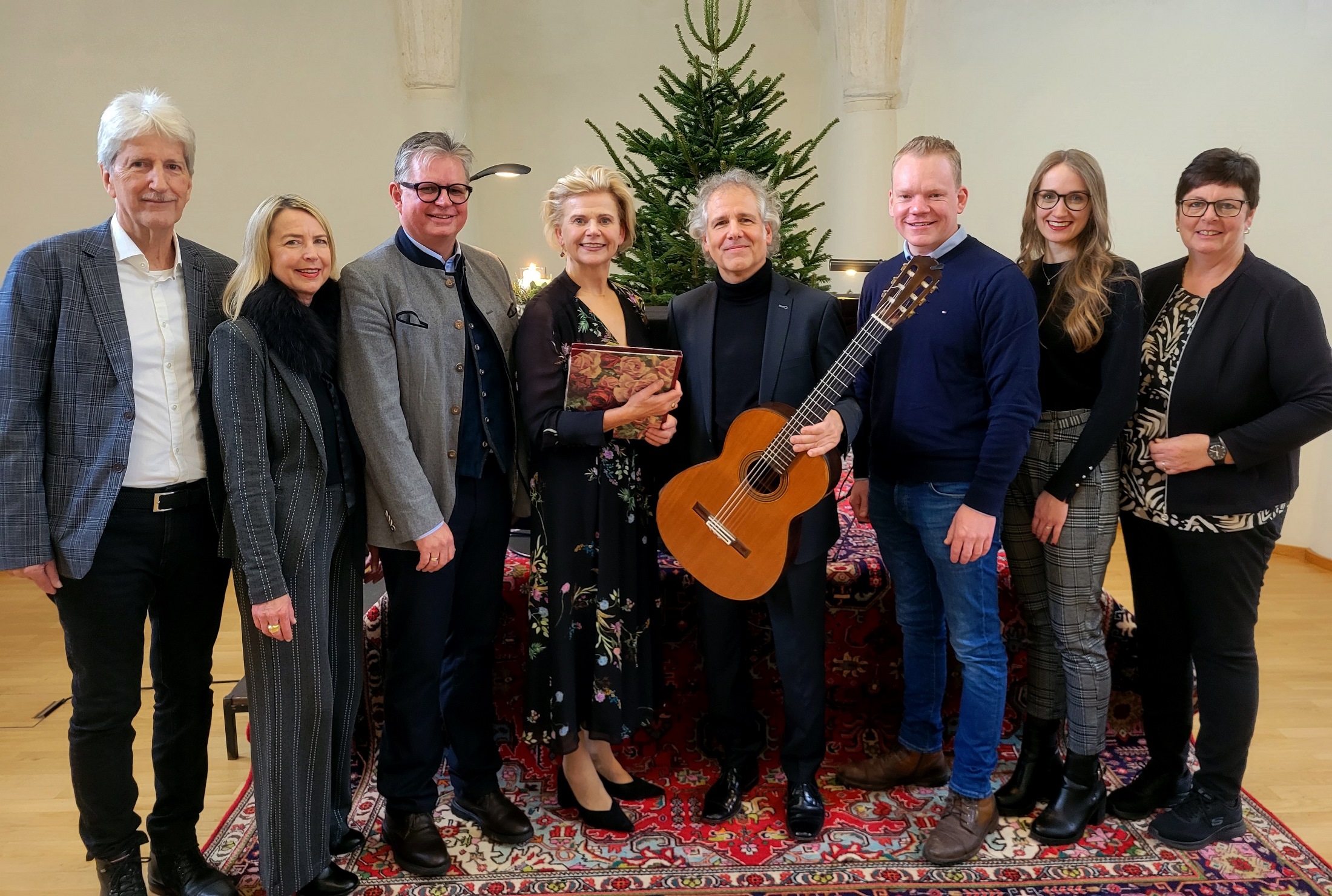 Wunderbarer Schloss Hofener Advent: Manfred Obexer (Kulturausschuss), Hausherr Peter Vogler, Renate Bauer (Rezitation) und Alexander Swete (Gitarre), Landesstatthalter Christof Bitschi und Kulturreferentin Petra Rührnschopf.
