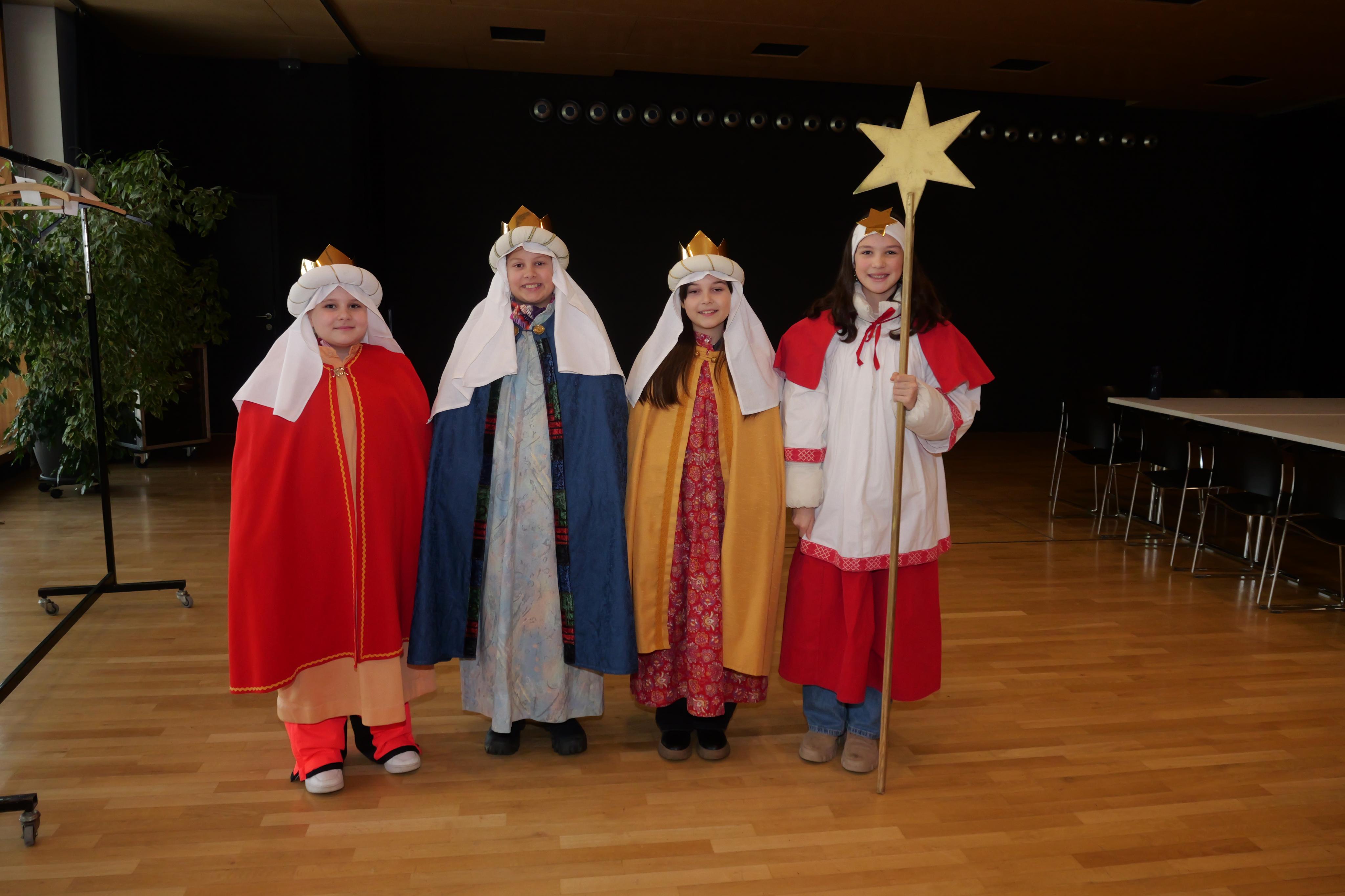 Eva, Carlotta, Emma und Karla als frisch eingekleidete Sternsingerinnen.