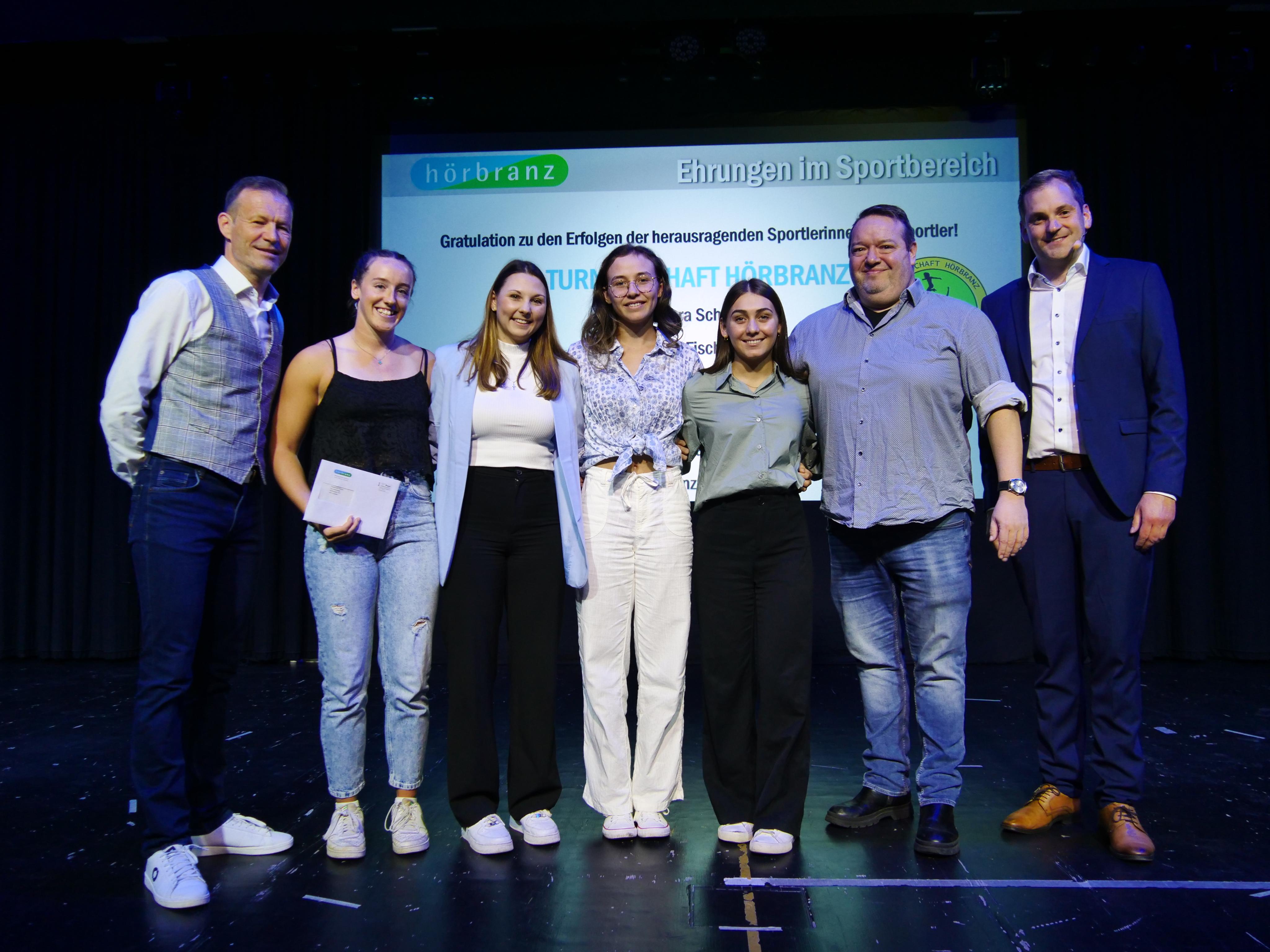 Erfolgreiche Sportlerinnen und Sportler der Turnerschaft Hörbranz flankiert von Gemeinderat Gerhard Achberger (li.) und Bürgermeister Andreas Kresser.